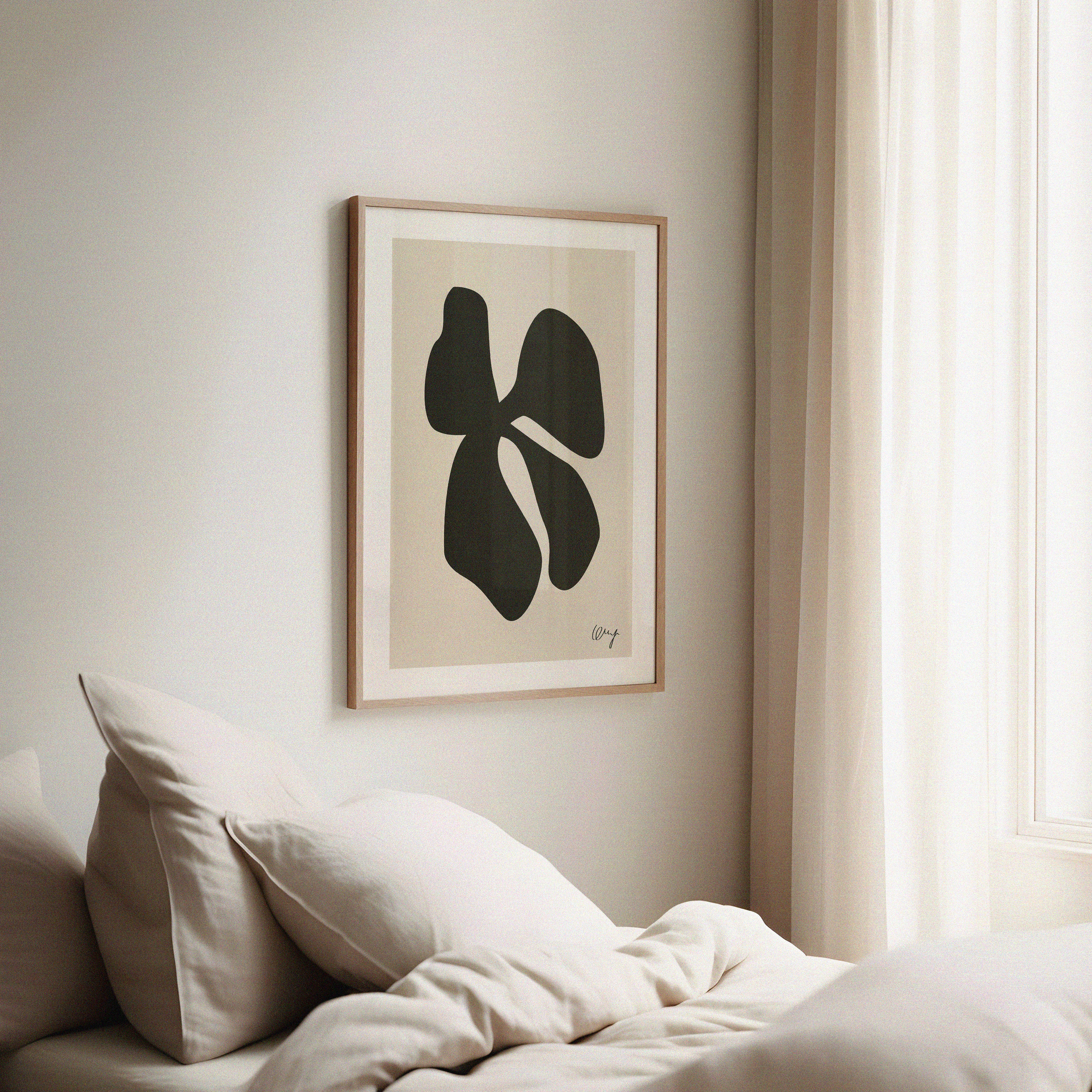 Minimalistische poster met een abstract zwart ontwerp op een beige achtergrond. Perfect voor een moderne en stijlvolle wanddecoratie!
